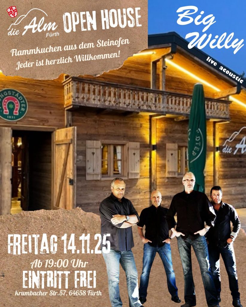 „Big Willy“, die Hochleistungskapelle aus dem Odenwälder Grenzgebiet klopft den Schnee von den Verstärkern und macht sich auf die Reise über die schneebedeckten Hügel um das Weschnitztal nach Fürth. Big Willy verhackstückt schöpferisch nahezu alles, was die letzten fünfzig Jahre nicht schnell genug in der Versenkung verschwinden konnte. Dabei demonstrieren die Musiker glaubhaft, dass es hierzu keiner allzu verzerrten Stromgitarren, filigranen Soundspielereien und übermäßigem technischem Firlefanz bedarf. Eine akustische Gitarre, ein Holzbass, ein Akkordeon und diverse Trommeln, das ist alles, was die vier auf ihrem Streifzug durch die Musik brauchen.