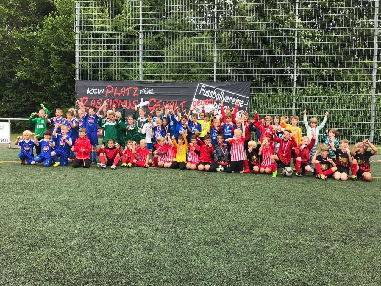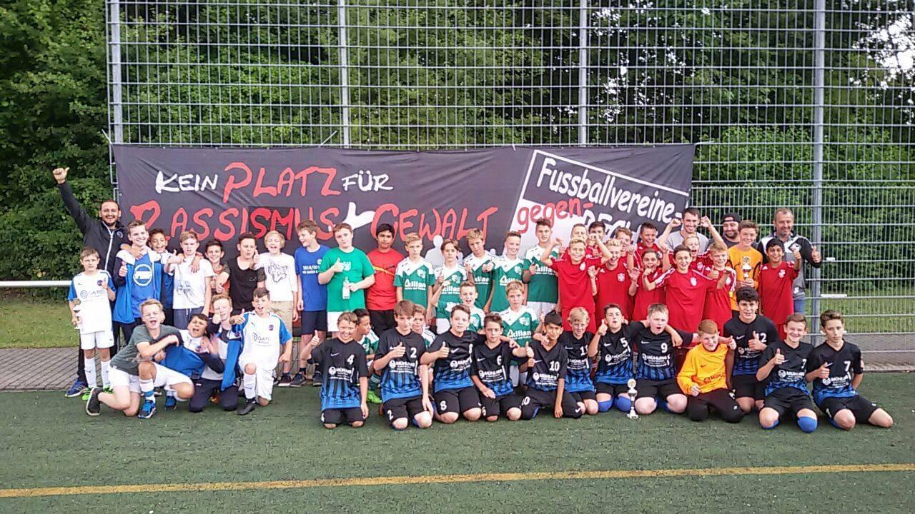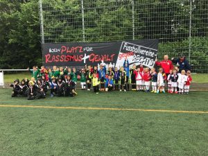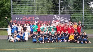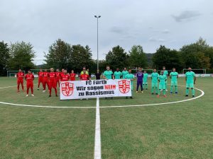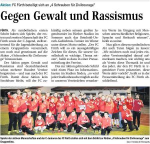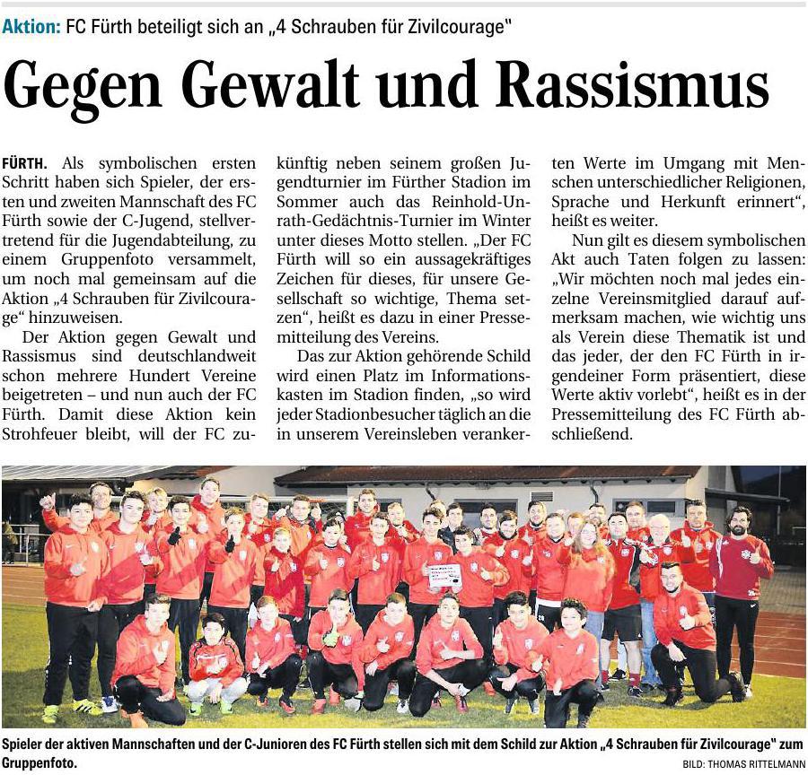 Als symbolischen ersten Schritt haben sich Spieler, der ersten und zweiten Mannschaft des FC Fürth sowie der C-Jugend, stellvertretend für die Jugendabteilung, zu einem Gruppenfoto versammelt, um noch mal gemeinsam auf die Aktion „4 Schrauben für Zivilcourage“ hinzuweisen.